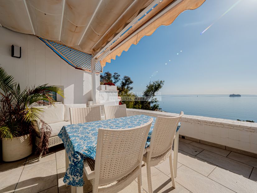 Spectacular semi detached villa with stunning sea views, highlight its excellent condition as well as the qualities, the luminosity of the rooms, the sea views from the interior of the house and its private pool. The street level floor is a closed garage with capacity for a large vehicle and motorcycle, through a staircase we access the main floor where we find a large living room with dining area, a modern open kitchen, a full bathroom with shower, iron/washer area and a terrace open to the sea. The first floor is distributed in 3 bedrooms and 2 bathrooms, the master bedroom with large windows open to the sea and en suite bathroom. In the distributor of the plant we access through a spiral staircase to a cosy room also with a large front window to the sea.